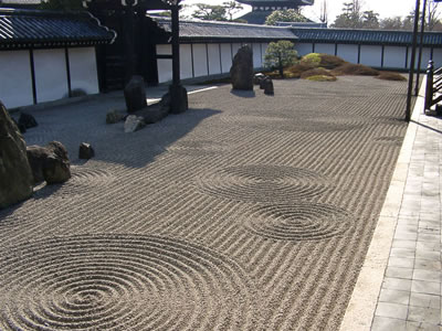 While dry landscape gardens are sometimes referred to as Zen gardens, it is more accurate to refer to them as karesansui. In Japan, this style of garden is often part of a Zen monastery, such as the famous Ryoan-ji in Kyoto. Often attached to the abbot’s quarters, this style of garden was not meant for meditation [zazen], but for contemplation. Care of the garden was part of the monk’s practice.